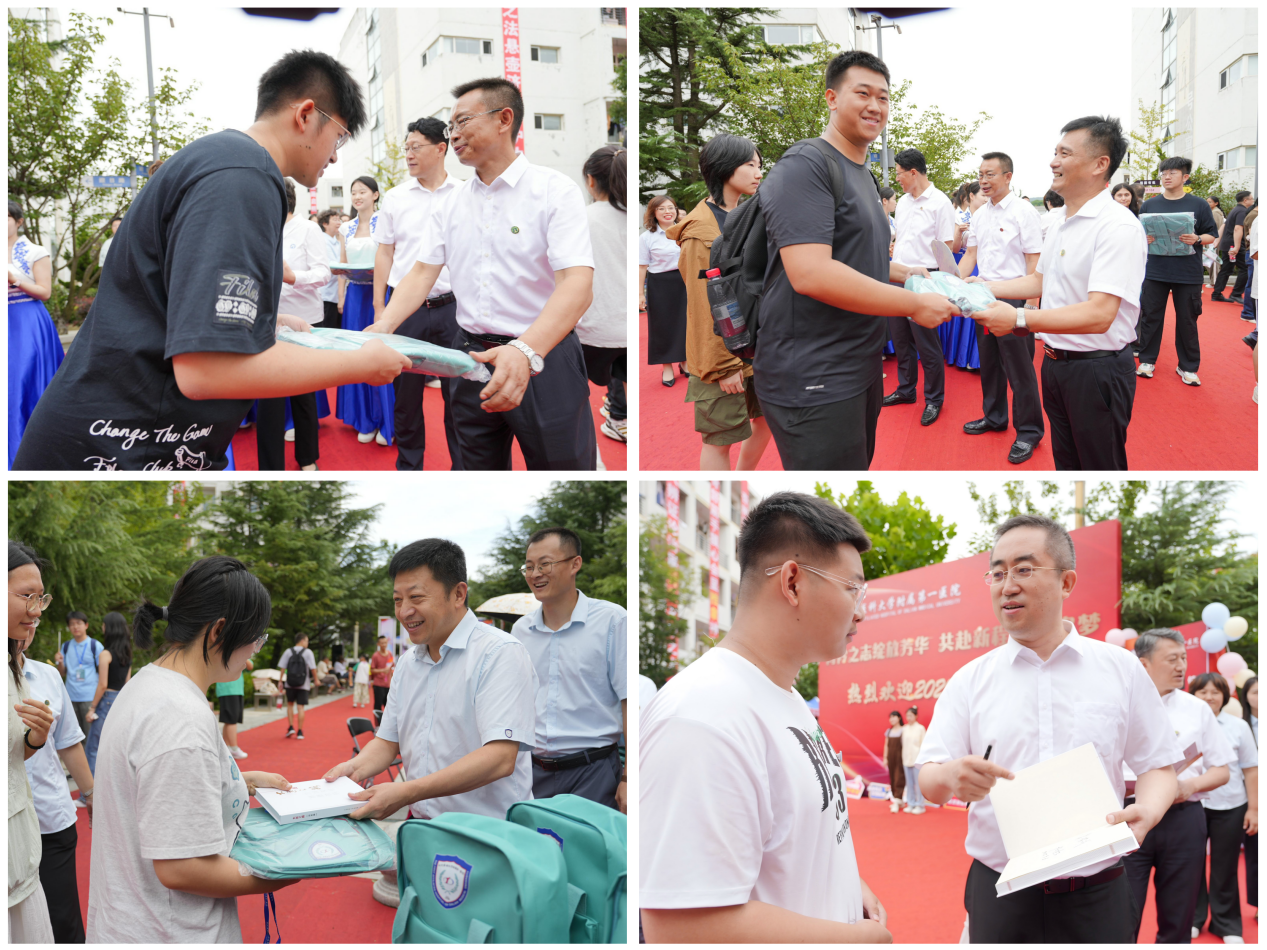 在春晖广场为新生统一发放的“一站式入学礼物”,包含院史文化书籍《大医之路》、印有“弘道笃行 精诚大医”院训的一卡通套、刻有姓名的专属智慧优盘,实用的希望之包,鼓励他们在红色基因的传承里,汲取迈步向前的动力,实现“物质+精神”的双补给。