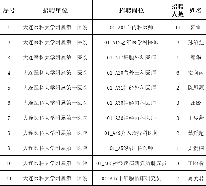 经报名、资格审查、考核,大连医科大学附属第一医院2025年公开招聘高层次人才第四批体检人员已确定,现将名单公布如下: