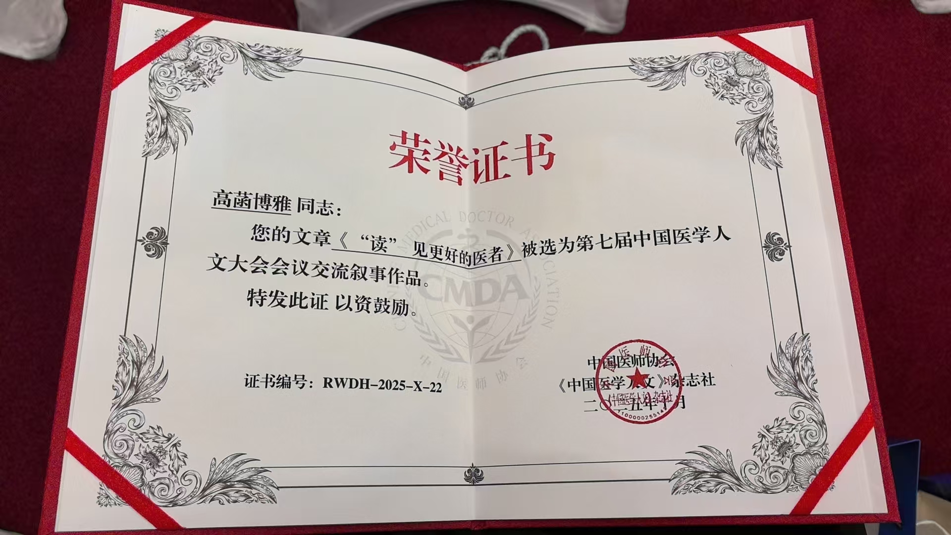 会上,中国医师协会《中国医学人文》杂志社公布了“第七届中国医学人文大会征文活动”的结果,大医一院健康管理中心高菡博雅医生投稿的《“读”见更好的医者》在全国上千篇稿件中脱颖而出,成功入选10篇登台交流论文名单并颁布荣誉证书,是大连市卫生健康系统唯一获此荣誉的医疗卫生机构。