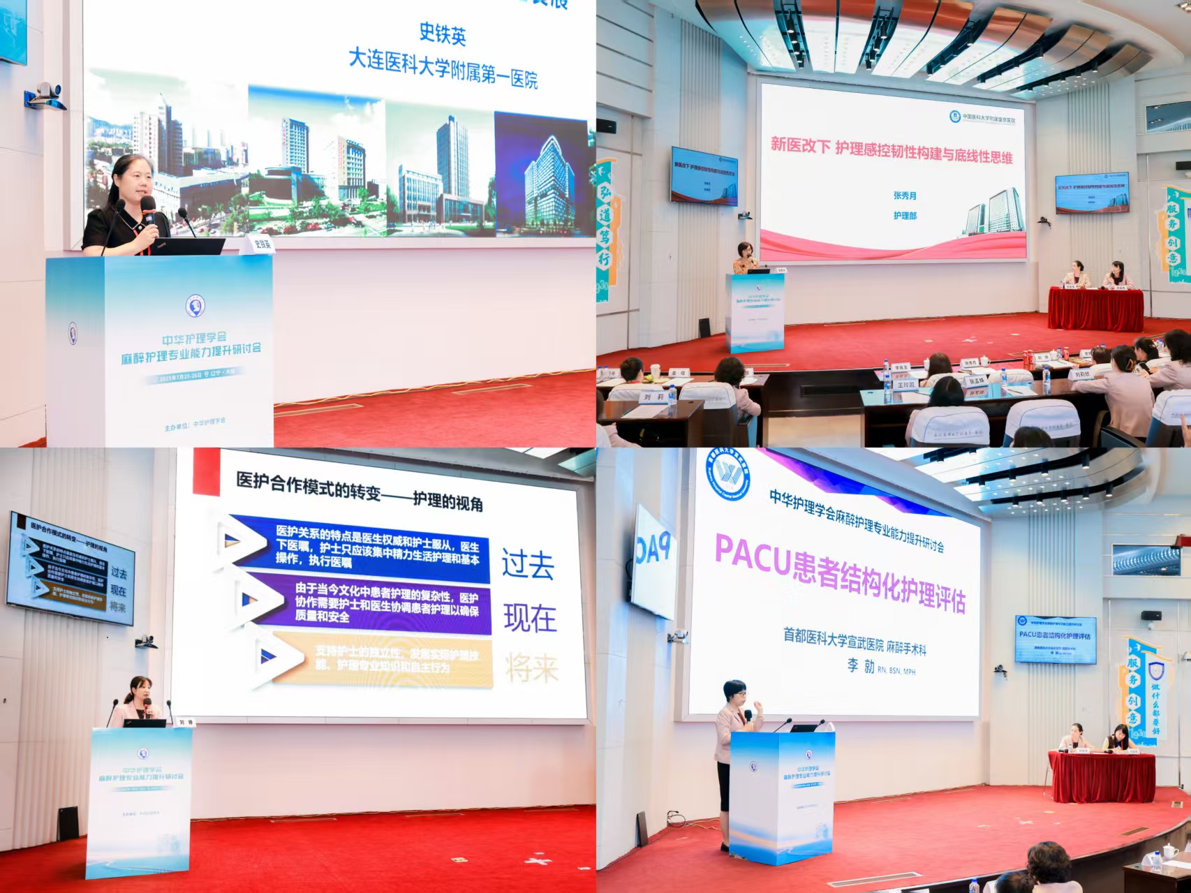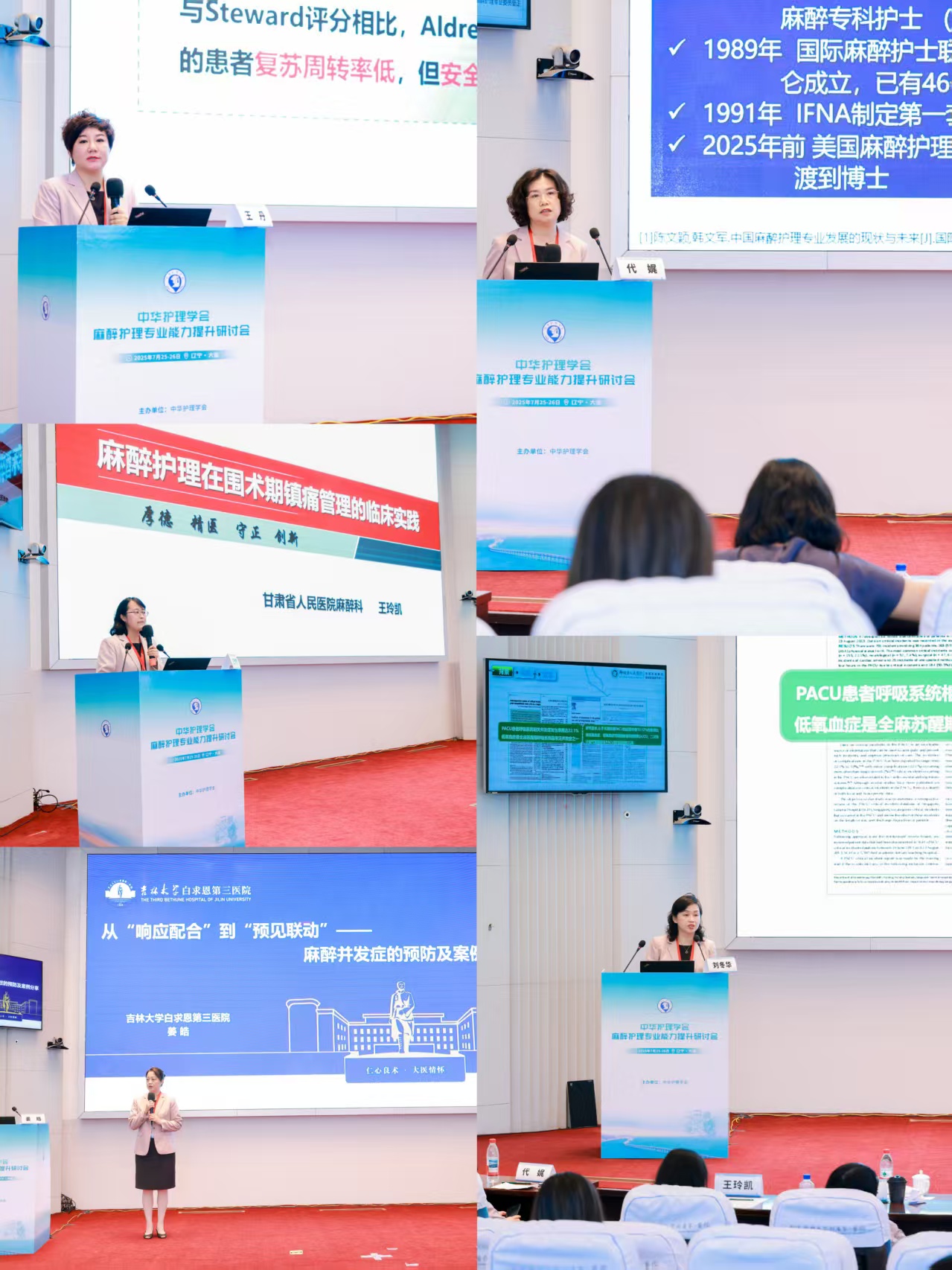 此外,多位专家分享前沿成果:哈尔滨医科大学附属第一医院王丹聚焦“全麻患者围麻醉期护理重点与策略”,强调全流程管理;吉林大学白求恩第三医院姜皓通过案例诠释麻醉并发症管理理念升级;甘肃省人民医院王玲凯探讨“麻醉护理在围术期镇痛管理的临床实践”;聊城市人民医院刘冬华分享“围麻醉期四位一体护理创新实践”成效;大医一院联合路院区手术室护士长代娓报告“麻醉护士主导型模式在PACU中的护理实践研究”,凸显麻醉护士价值与作用。