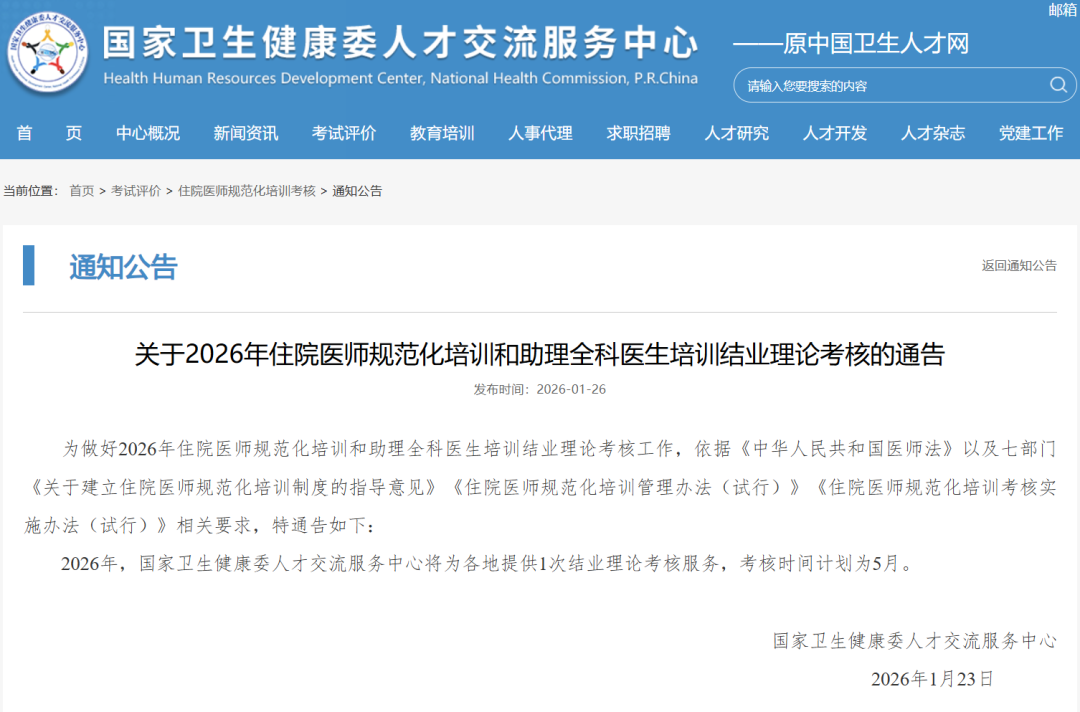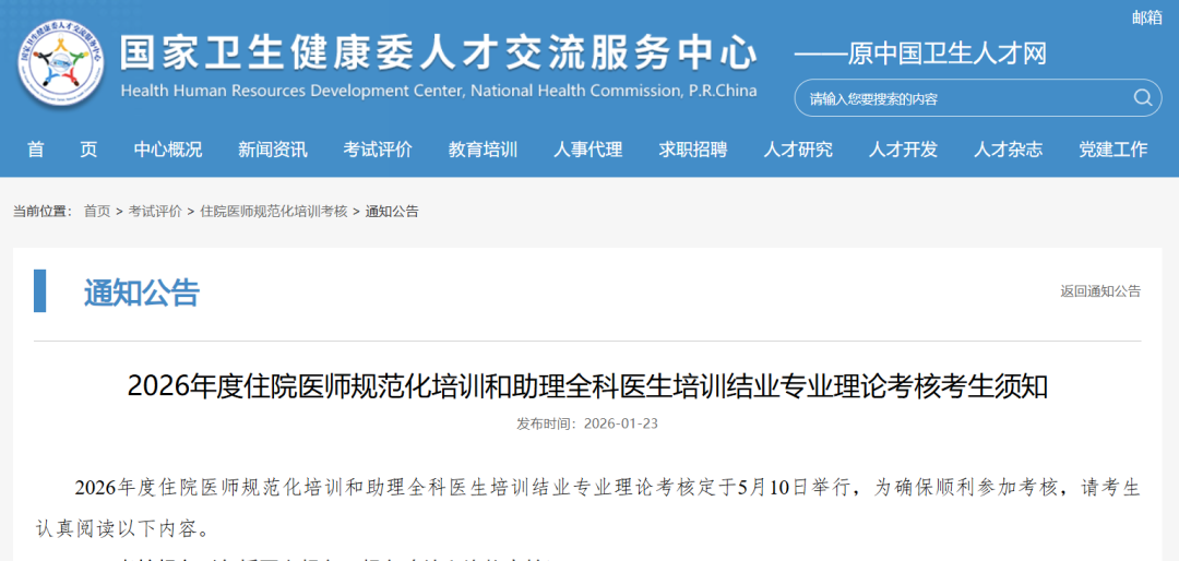 今日,国家卫生健康委人才交流服务中心发布了【关于2026年住院医师规范化培训和助理全科医生培训结业理论考核的通告】和【专业理论考核考生须知】文件,明确今年专业理论考核定于5月10日举行!