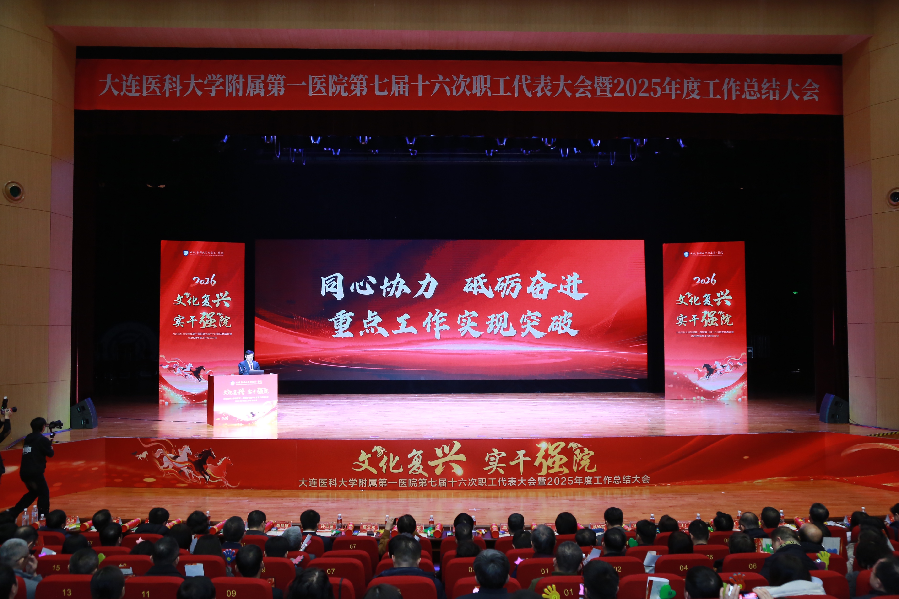 大会现场播放了《凝心聚力启新程——大连医科大学附属第一医院2025年回望》视频片,影片以六大篇章立体呈现大医一院过去一年的奋进足迹,真实记录了医院以党建引领发展、以文化凝聚力量、以实干拓展边界、以创新驱动未来的生动实践,每一帧画面都诠释着医院在高质量发展道路上的坚定步伐与使命担当。会上,大连医科大学党委书记李海洋讲话。大医一院党委副书记(主持工作)马灵斐致辞。大连医科大学副校长、大医一院院长夏云龙代表院领导班子作第七届十六次职工代表大会工作报告。