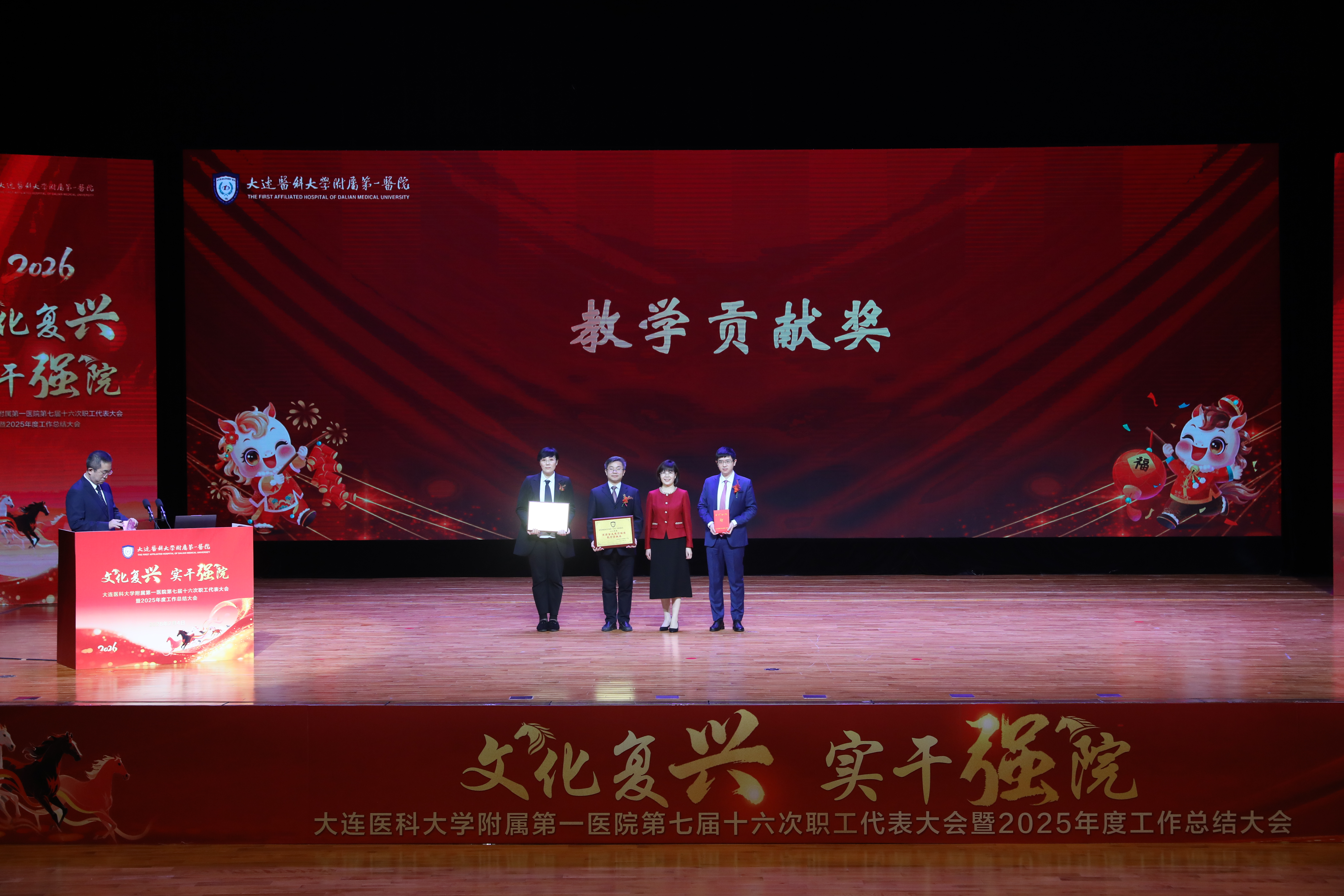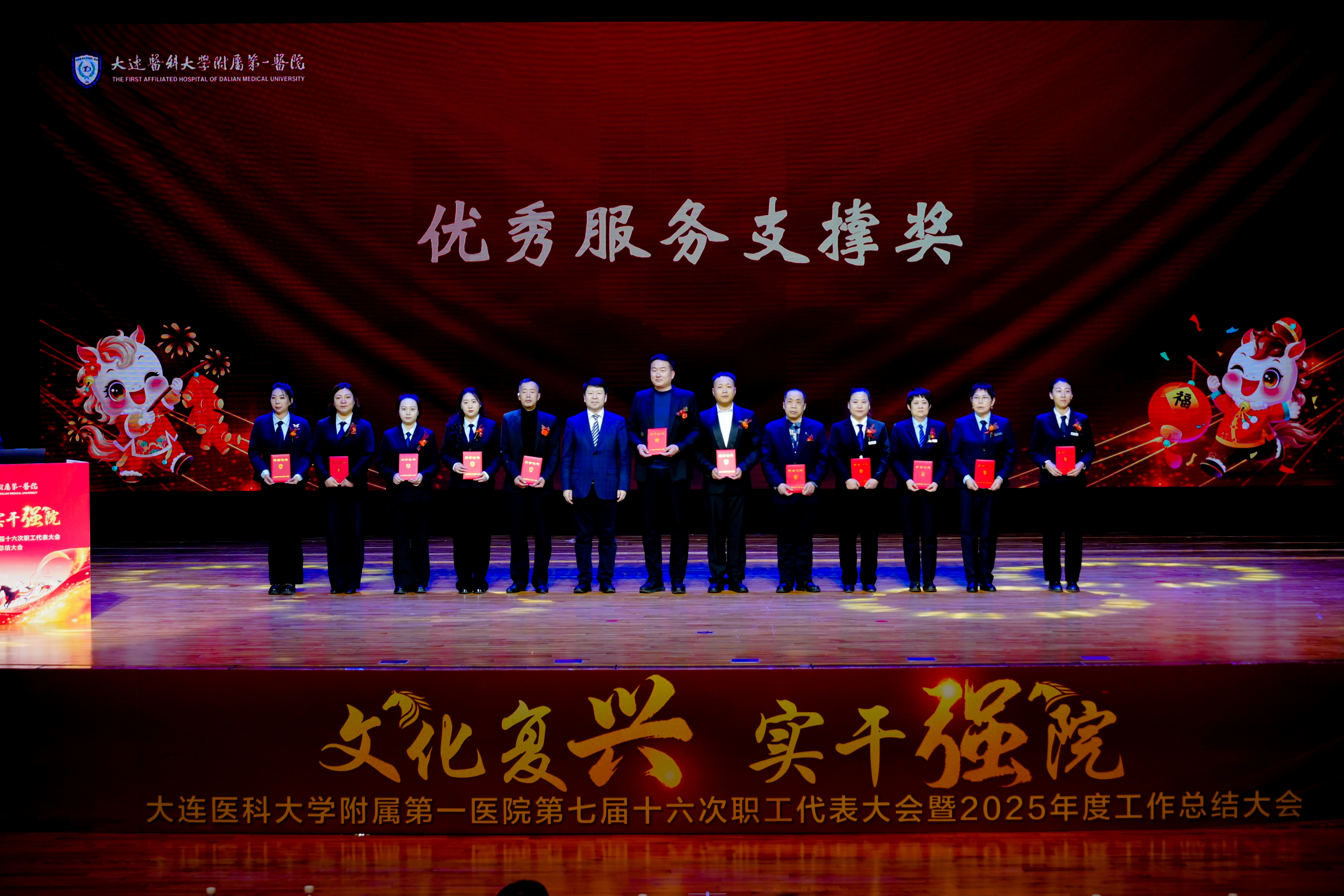 李海洋指出,本次会议不仅是总结成绩、表彰先进的总结会,更是凝聚共识、激发干劲的动员会和统一思想、部署任务的部署会。必须立足更高站位、更宽视野、更实举措,审视过去、规划未来,全力推动医院高质量发展。过去一年,附属第一医院始终把党的政治建设摆在首位,主动融入健康辽宁建设和大连经济社会发展大局,统筹推进医疗、教学、科研、管理工作,医疗服务能力持续提升,人才培养质量全面提高,中西医协同并进等方面取得扎实成效。他强调,全院上下要坚持高质量党建引领,主动服务健康中国战略;发挥自身优势,打造百姓信赖的“家门口”好医院;强化医教研协同,深化校院联动,形成发展合力,共同开创医院高质量发展新局面,确保“十五五”开好局、起好步,以“一马当先”的担当和“马不停蹄”的干劲,为健康辽宁、健康大连建设贡献更大力量。大医一院副院长杨超宣读了2025年度医院先进集体和个人名单并主持颁奖仪式。院领导班子上台为先进集体和个人颁奖。大医一院副院长李艳霞主持大会。