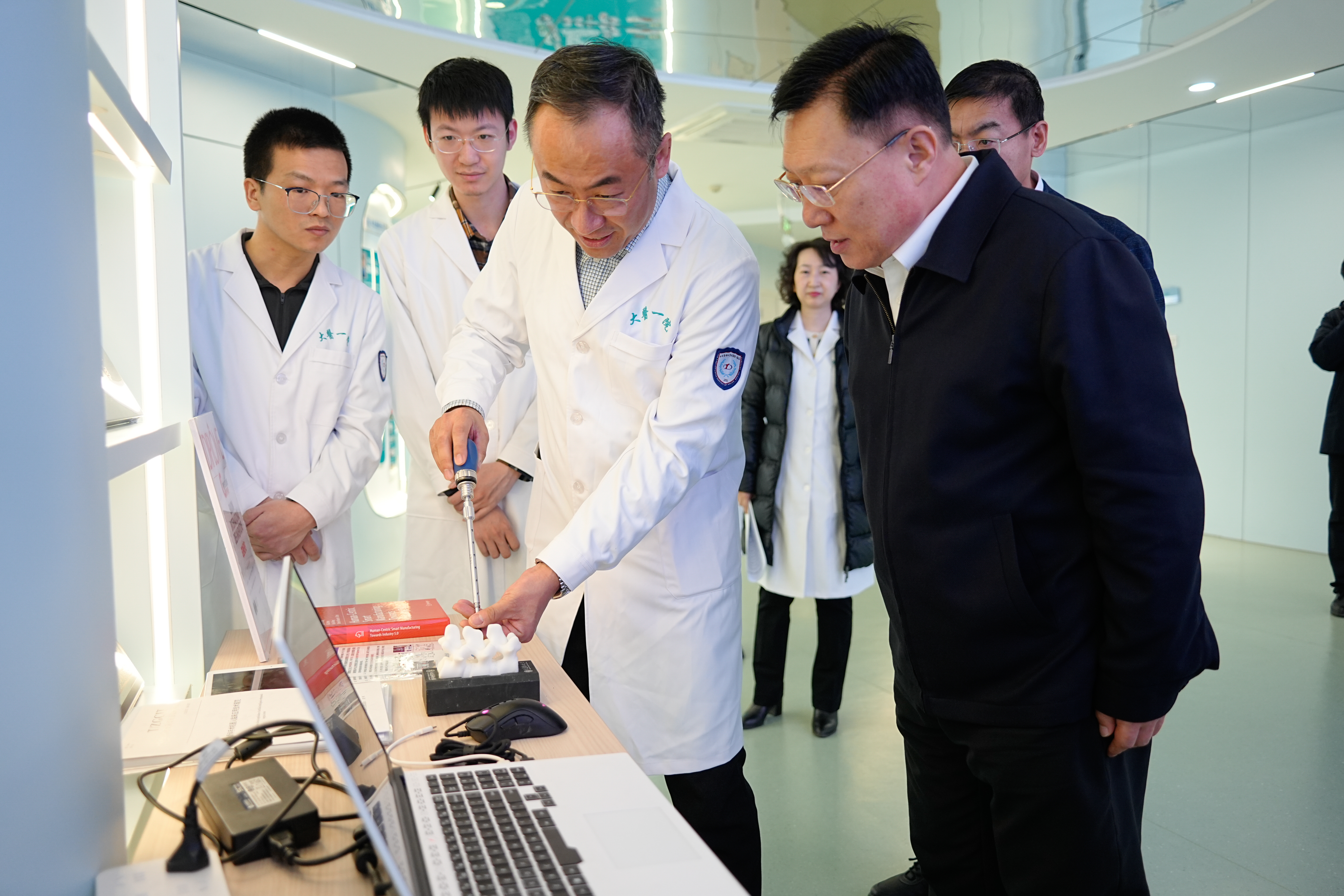 郝明对大医一院在医工合作中取得的代表性成果给予充分肯定,并鼓励医院进一步深化与工科院校的协同创新,持续推动科技创新与成果转化,聚焦智能诊疗与医疗机器人、高端医疗装备与先进生物材料等重点领域,加强前沿交叉技术攻关,力争在关键核心技术领域实现更大突破。
