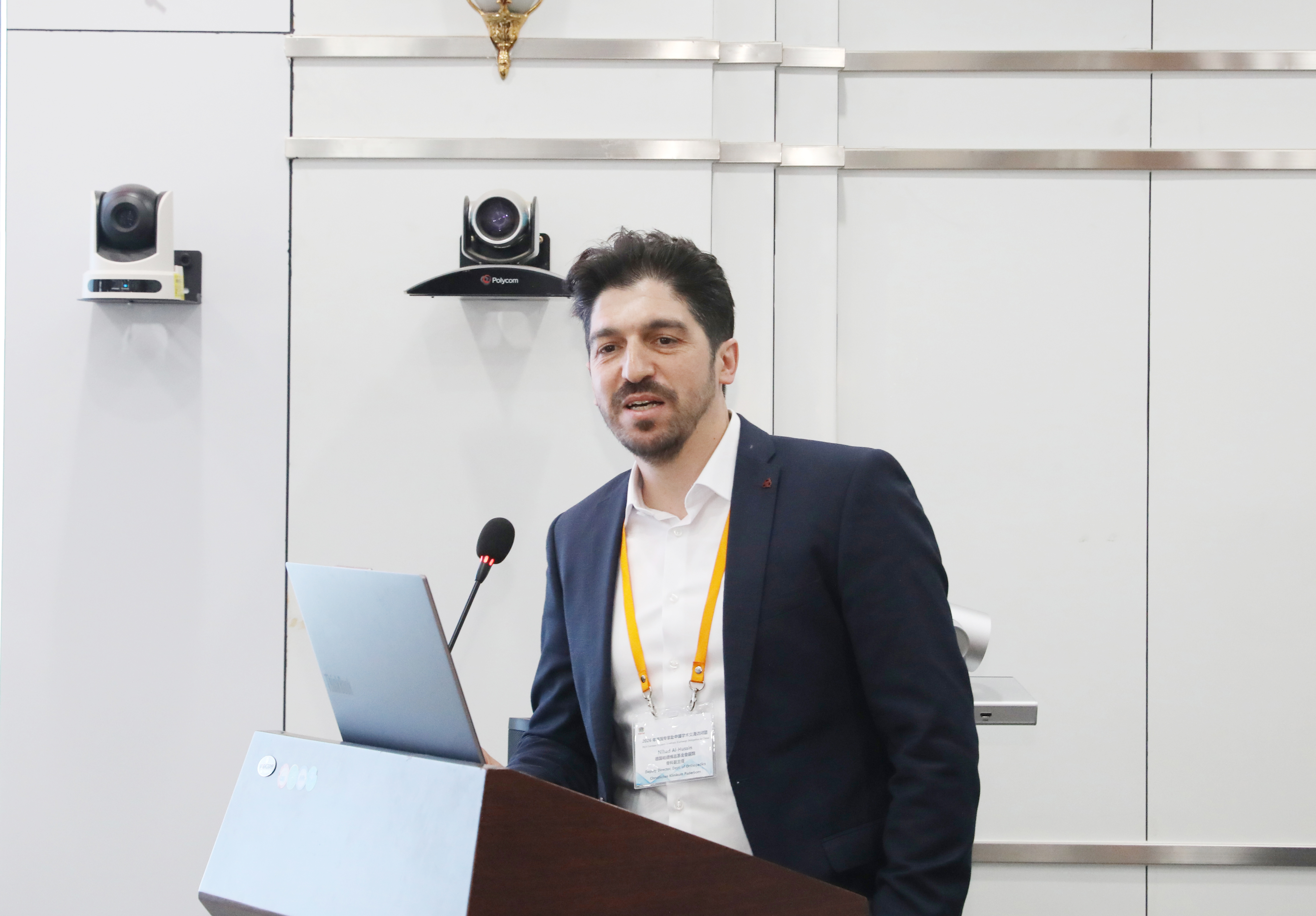 学术交流环节,Jan Borggrefe教授和Nihad Al Hussin教授分别就放射学在个性化医疗与科学中的作用、神经血管疾病微创治疗、动态髌股内侧韧带重建术等主题作专题报告。大医一院外科教研室副主任张振、放射科副主任王丽君、介入治疗科副主任纪东华分别就医院骨科发展、放射科前沿技术及介入科临床实践进行了介绍。随后,大连医科大学科技转化中心副主任、大医一院骨科学科带头人王寿宇,放射科(学科)负责人、放射诊断学教研室主任、放射科副主任苗延巍,介入治疗科教授李克同与会人员一起,围绕报告内容及专科学术问题进行深入交流:骨科方面,双方就临床技术应用、学科建设路径、诊疗模式优化等内容展开深入探讨,在思想碰撞中凝聚共识,在经验分享中拓宽视野;放射科方面,医院以能谱CT、5T高清成像为代表的结构成像、MR多模态成像、以APT及多核MR成像为代表的功能代谢成像、AI辅助相关的研究等成果获德国专家高度认可;介入治疗科方面,双方就AI辅助诊疗、静脉窦狭窄新型支架应用、颅内中小血管再通等国际热点议题进行了富有建设性的专业探讨。